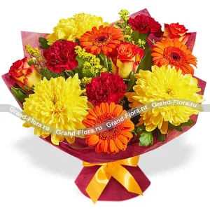Букет оранжевых роз + хризантемы - Осенний коктейль