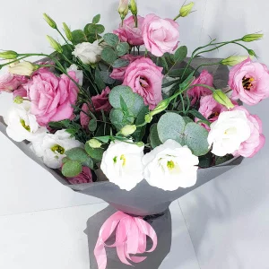Сны о тебе – букет из розовой и белой розы с эустомой