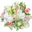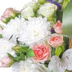 Уменьшенная: хризантема кустовая белая - 2 шт., роза кустовая белая - 1 шт., роза кустовая розовая - 1 шт., эустома белая - 1 шт., альстромерия белая - 2 шт., декоративная зелень, оазис, корзина малая.