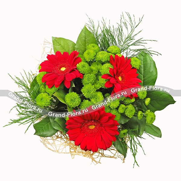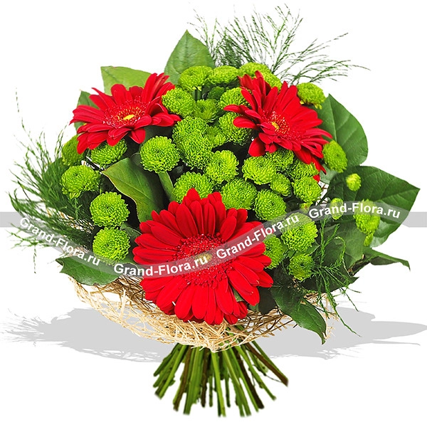 Обворожительный букет с безумно яркими, пылающими герберами. Эти цветы символизируют солнце, улыбку, а также выражают свою симпатию от дарителя. Удачно вписанные хризантемы и листочки зелени создают гармоничный контраст красного с зеленым. Хризантемы олицетворяют открытость, намекая на дружеские чувства и возможно нечто большее. Такой букет подойдет в качестве подарка другу или подруге, он также выразит только зарождающиеся чувства.