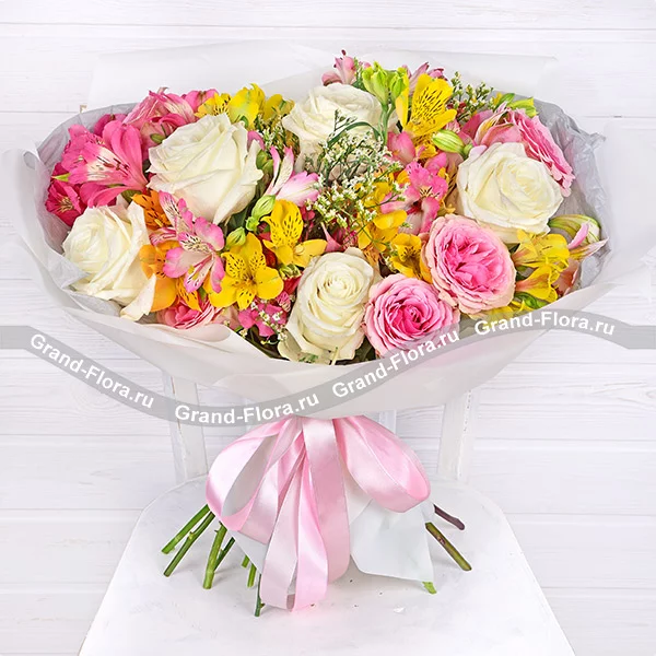 Роза белая – 5 шт., роза розовая –5шт., альстромерия желтая – 4 шт., альстромерия розовая –5 шт., лимониум белый– 3 шт., упаковка, лента.