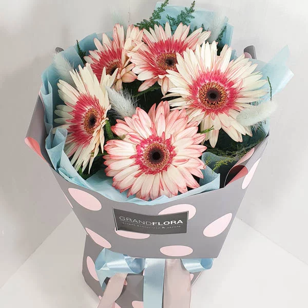 Внимание: возможно изменение оттенка гербер. От белой/кремовой герберы до малиновой. Уточняйте эту информацию перед покупкой