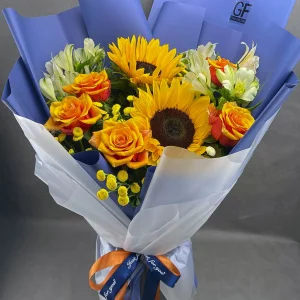 Этот букет лишь подтверждает эти слова, обличая простые с виду цветы в изысканный букет ярчайшего настроения, всепоглощающей радости и при этом сдержанной изысканности. Цветы, сохранившие в себе лучи солнца, которые будут радовать и согревать. Букет несомненно поднимающий настроение и способный подарить улыбку в самый пасмурный день.